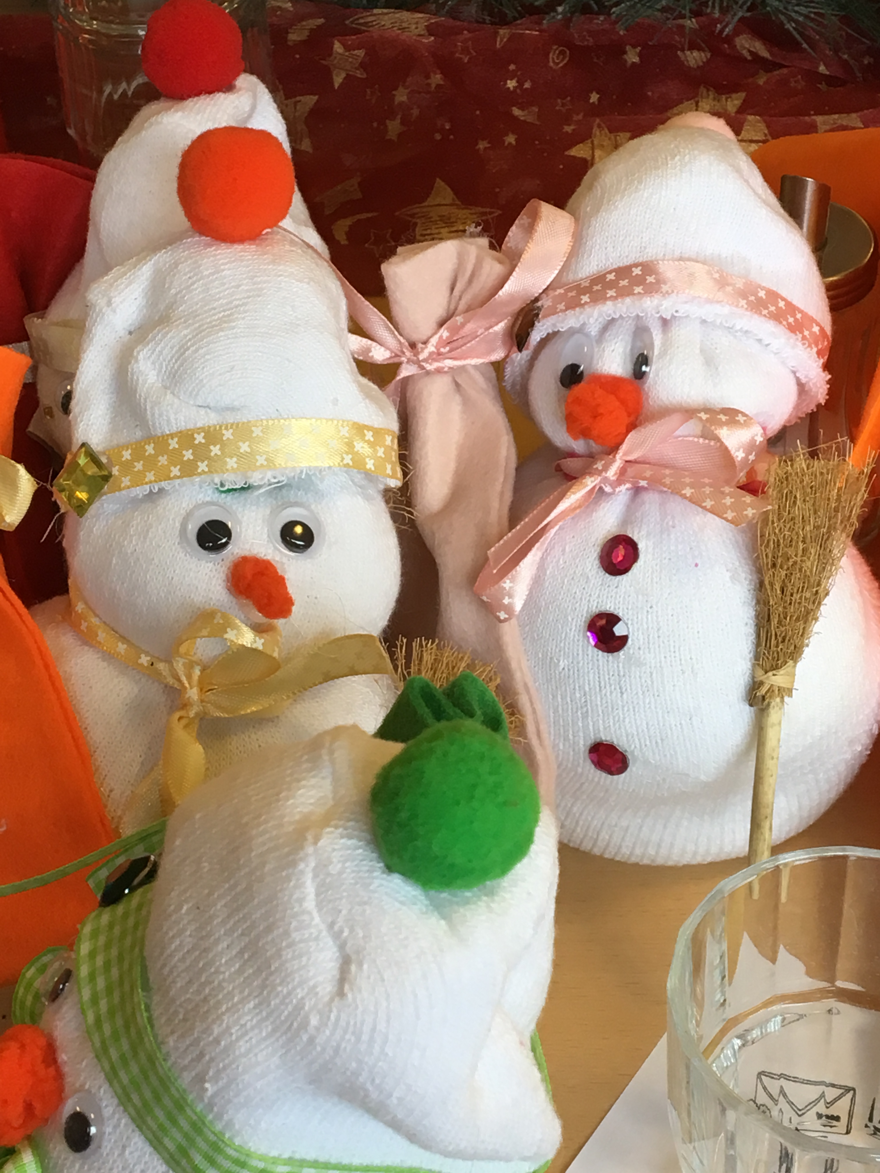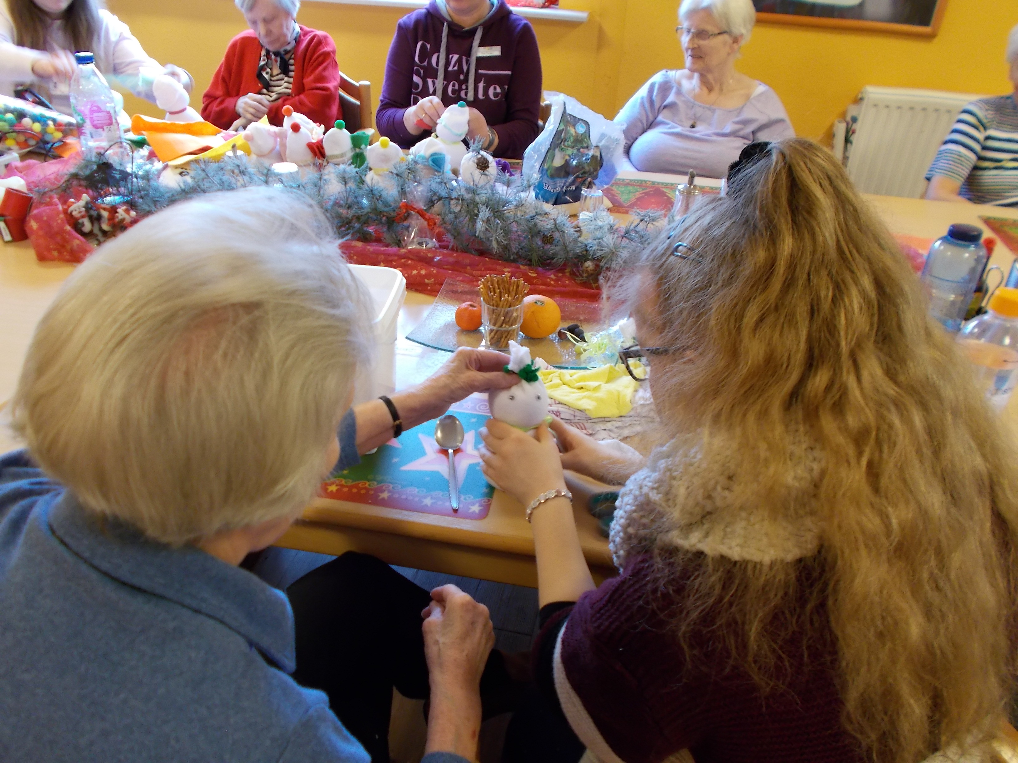 Zu Beginn wurden wir auf die drei Wohnbereiche aufgeteilt. Eine Gruppe bastelte mit den Senioren Schneemänner, eine andere Gruppe bastelte Bäume und Engel und die letzte Gruppe bastelte Weihnachtshäuschen. Angefertigt wurden von jeder Gruppe jeweils 8 Exemplare, die anschließend zu einem Adventskalender zusammengestellt wurden.
