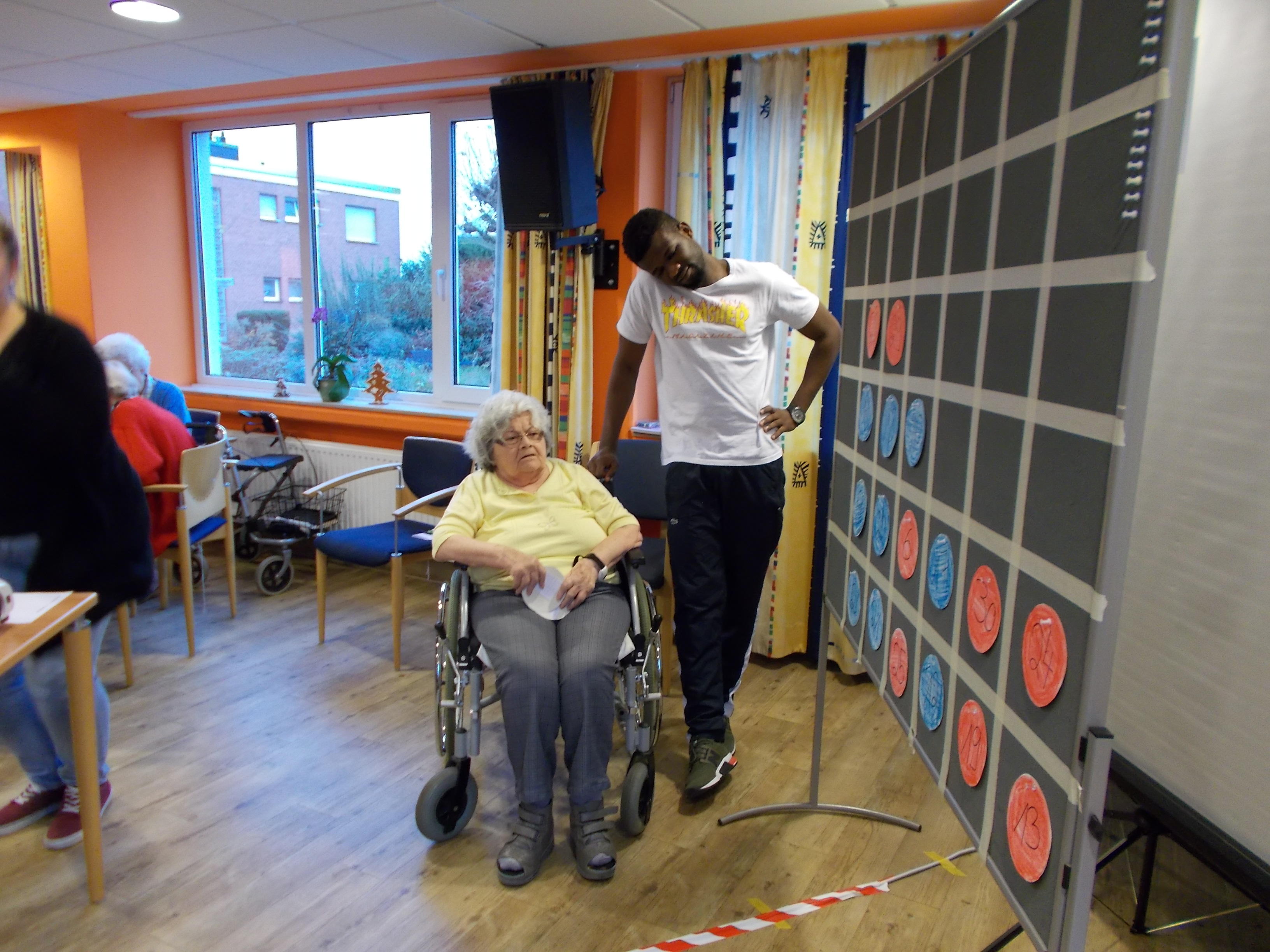 Am Nachmittag fand dann ein Crazy-Bingo-Nachmittag mit den Senioren im Speisesaal statt. Bei diesen Spielen bekam jeder Bewohner/ jede Bewohnerin eine Bingo-Karte mit jeweils fünf unterschiedlichen Spiele: