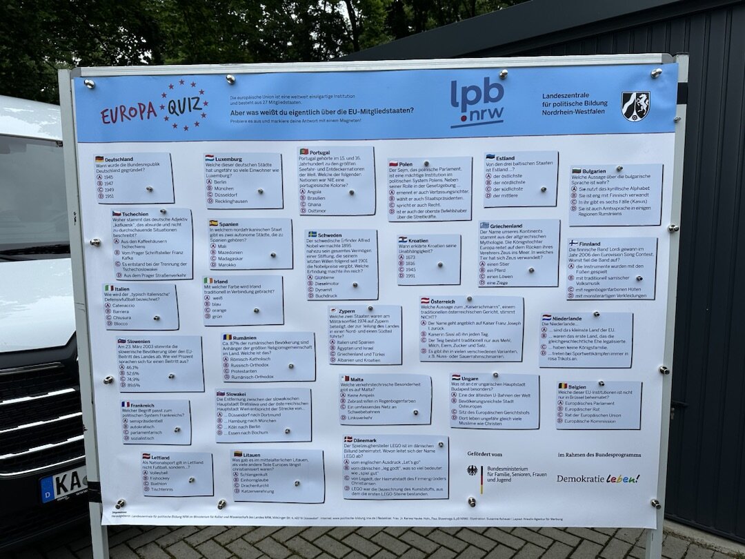 Der Europabus der LKS (Landeskoordinierungsstelle für das Projekt NRWeltoffen) ist ein Teil der Maßnahmen, die der Kreis Heinsberg im Rahmen der Demokratieoffensive unterstützt. Dabei bot sich in Erkelenz die Kooperation mit der Demokratiewerkstatt des Nell-Breuning-Hauses am Berufskolleg Erkelenz an. Dadurch hatten die Schülerinnen und Schüler nicht nur alle die Möglichkeit, sich mit Infomaterial am Bus und den anderen Infoangeboten zu versorgen. Drei Gruppen aus jeweils rund 50 Schülerinnen und Schülern nahmen auch an den von den Fachlehrern und Pädagoginnen des Nell-Breuning-Hauses organisierten Workshops teil. Drei Themen wurden dort behandelt: 1. Einheitliche Ladekabel, 2. Die Seenlandschaft in der Tagebauregion nach Ende des Abbaus, 3. Die gemeinsame europäische Außen- und Sicherheitspolitik.