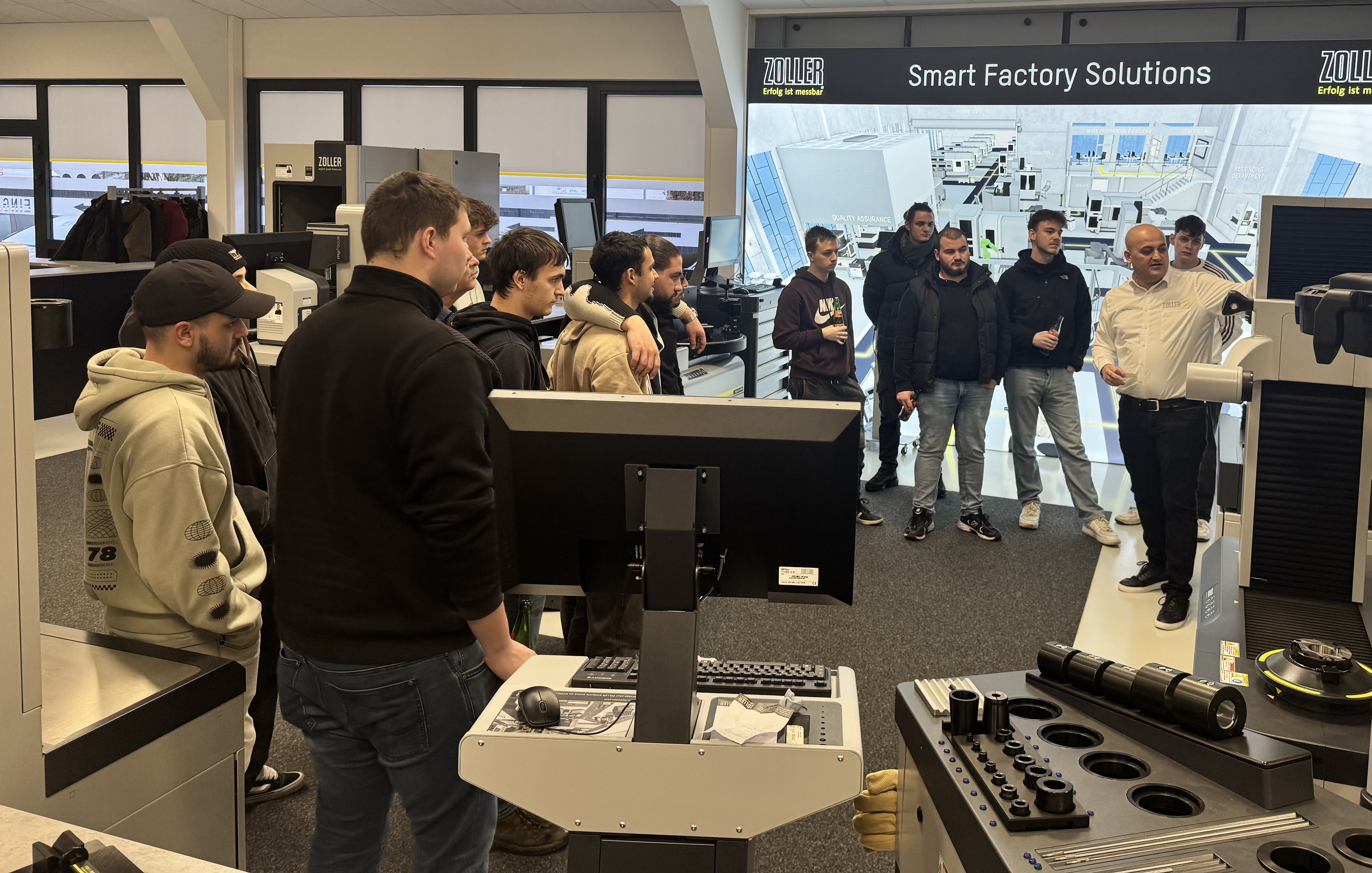 Ein Highlight der Exkursion war die Vorstellung des umfassenden Produktportfolios von ZOLLER. Die Lernenden erfuhren, wie ZOLLER mit innovativen Lösungen in den Bereichen Werkzeugeinstellung, -inspektion und -verwaltung Maßstäbe setzt. Besonders beeindruckend war die Präsentation der ZOLLER Einstell- und Messgeräte, die durch Präzision und Zuverlässigkeit überzeugen, sowie die Softwarelösungen TMS Toolmanagement Solution zur Werkzeugverwaltung, die einen reibungslosen und effizienten Ablauf in modernen Fertigungsbetrieben ermöglichen.